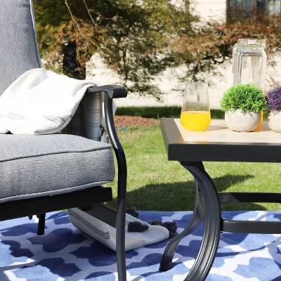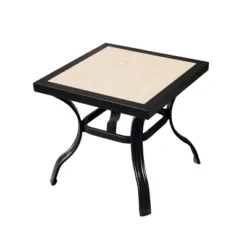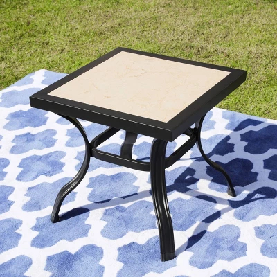 - Set includes 1 tile top side table and 2 armchairs with seat and back cushions