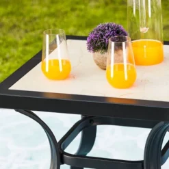 Dine with a friend while relaxing upon this delightful bistro set! the design of the product makes it easy to carry a conversation one-on-one and simultaneously enjoy a light snack or meal. Crafted of an steel frame with a powder-coated finish, plus with both back and seat cushion, the chairs will serve you simple comfort. Tile top square is easy to maintain and has enough space for your drinks and snacks.
