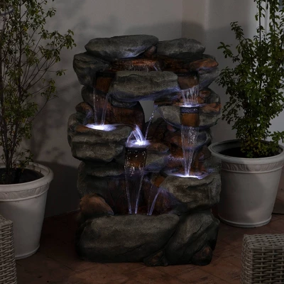 Unplug from the day and meditate to the sound of flowing water with Alpine’s 54″” tall Indoor/Outdoor Waterfall Rock Fountain with LED lights. This relaxing floor fountain statue provides a tranquil and soothing addition to your yard, porch, or patio and even inside your home. Constructed from durable polystone and fiberglass, the fountain is weatherproof, rust-resistant, and resilient for use in your home’s interior décor or outside. This unique and versatile décor piece includes LED lights for a tranquil and soothing addition to your home’s backyard or indoor décor. Replicating a rainforest scene, the fountain has a natural appearance and realistic stone textures. Relax to the sounds of the calming natural water flow as it trickles down through the rocks. For quick installation and convenient operating, the fountain includes all necessary parts, including a pump, to begin creating an outdoor oasis. This fountain measures 38″L x 27″W x 54″H to fit almost any indoor or outdoor space and includes a one-year manufacturer’s warranty from date of purchase.
