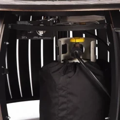 Whether your outdoor retreat is located in the mountains, on the coast, or somewhere in between, this fire table set will extend your evenings with friends and family around the fire. With this addition you can enhance your outdoor setting with even more ambiance and relaxation. This fire table set comes with an Outdoor Aluminum 44 in. Round Fire Table Set with Four Deep Seating Swivel Rocking Chairs, Fire Beads, Lid, Propane Tank Cover and Table Fabric Cover. The dimensions for the fire table are: 44″ L x 44″ W x 24.5″ H, 88 lbs. Each chair dimensions are: 28.4″ L x 33″ W x 37.8″ H, 29 lbs. The chair seat is 12.6″ H from the seat to the floor.