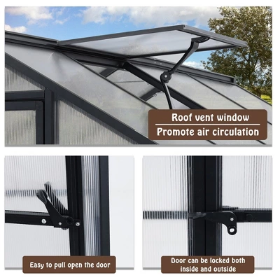 Introducing the AOODOR 6′ x 8′ Walk-in Greenhouse, a spacious and durable solution for backyard gardening. With a heavy-duty aluminum frame and premium polycarbonate panels, this greenhouse provides ample space for growing a variety of plants. The adjustable vents and lockable doors ensure proper ventilation and security. Easy to install and maintain, it’s the perfect choice for hobby gardeners. Experience the joy of gardening with this reliable and functional greenhouse.