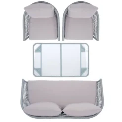 The classic barrel chair gets a streamlined modern update in this Belmi 4 Piece Outdoor Living Set. Featuring two arm chairs, a loveseat, and smooth glass top coffee table, the timeless silhouettes of Belmi’s seating is transformed for today’s outdoor entertaining with gray rope details and matching gray cushions. This conversation set adds a fresh look to any outdoor space.