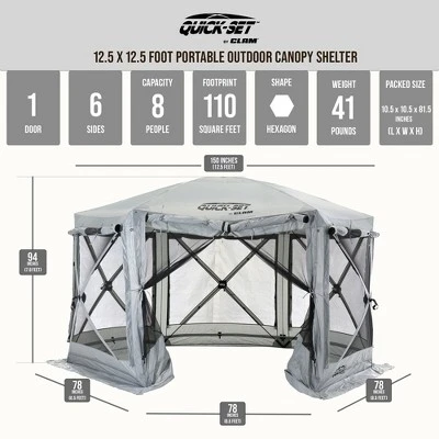 Rain or shine, enjoy the outdoors in your CLAM Quick-Set Pavilion Portable Outdoor Gazebo Canopy Shelter. This 12.5 x 12.5 x 7.8-foot pop-up canopy is designed to provide shelter and protection from the elements while outdoors. Ideal for camping, picnics, and sporting events, this 6-sided outdoor gazebo keeps the elements from ruining your day. The no-see-um mesh screen and extra-wide skirt keep the bugs out, and it is spacious enough to fit a picnic table and chairs inside so you can enjoy your meal in peace. If unwanted weather arises, the built-in wind panels can be rolled down for added protection against wind and rain.No assembly is required, and it sets up in just 60 seconds. When your stay is over, the Quick-Set Pavilion can be easily stored in its convenient oversized carry bag. The pop-up canopy packed size measures 10.5 inches long by 10.5 inches wide by 6.79 feet tall. Hub to hub, this tent measures 150 inches long, 150 inches wide, and 7.8 feet at center height. The set-up size measures 12.5 feet across the inside.Say goodbye to sunburns and bug bites when you pop up the CLAM Quick-Set Pavilion Portable Outdoor Gazebo Canopy Shelter.