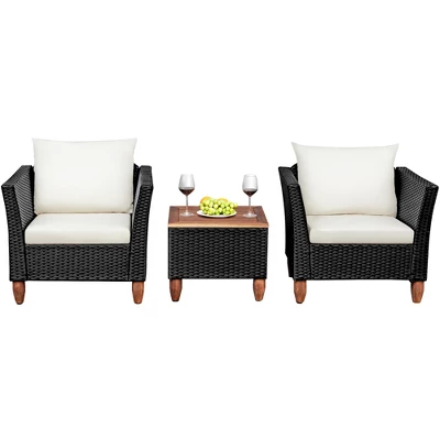 - Sturdy Frame with Exquisite Rattan: The frame of this patio furniture set is made of steel and wrapped with weather-resistant wicker which ensures the durability. In addition, the feet of the set are crafted with solid wood to add stability.