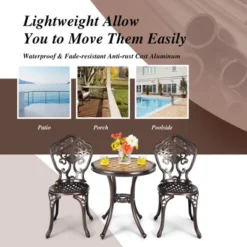 - Cast Aluminium Bistro Set: The patio table and chair set is made of durable cast aluminum that resists rust and weather. The stable construction with reinforced structure ensures long-lasting use without crack or deformation. The maximum weight capacity of each chair: 330 lbs, table: 110lbs.