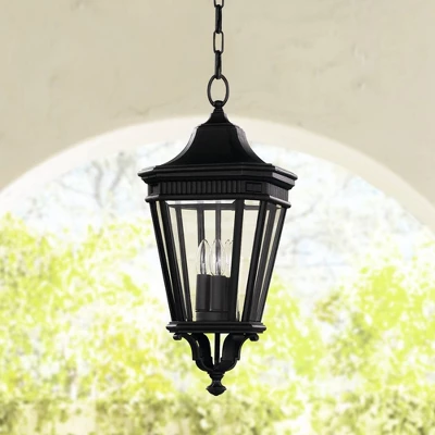 Three timeless candelabra bulbs glow behind delicate panels of beveled glass in this handsome black finish outdoor hanging light. With a classic design and intricately detailed frame, it’s an elegant way to illuminate a traditional style garage, entryway or porch. From the Cotswold Lane collection by Generation Lighting.
