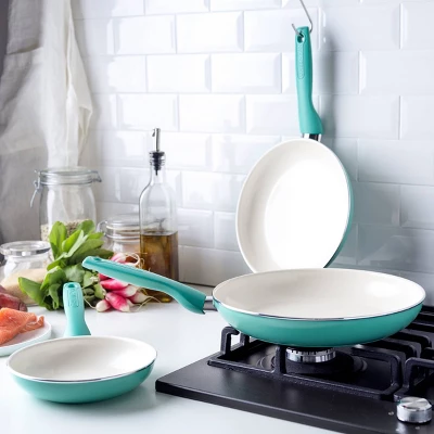 Add a touch of color to your kitchen with this vibrant set of frypans from the GreenPan Rio collection. This versatile set is perfect for a huge array of kitchen tasks, from early morning eggs to late-night snacks and everything in between. And it’s designed to make any dish better. How? This pan features GreenPan’s Thermolon healthy ceramic nonstick coating—an easy release and wipe clean coating that’s free of PFAS, PFOA, lead, and cadmium for worry-free cooking. Unlike many other nonstick coatings, it will never release toxic fumes, even if it’s overheated. This durable coating is reinforced with diamonds to provide peak nonstick performance longer. The pan’s heavy-duty construction gives you even heat distribution while the stay-cool Bakelite handle give you a comfortable grip and total control. This cookware set includes 7″, 9.5″, and 11″ frypans. Dishwasher safe. Each pan is oven safe to 350°F. Limited lifetime warranty.
