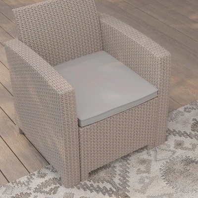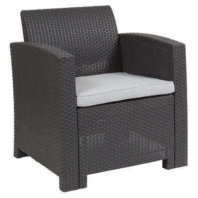 Well composed with modern materials and classic design, this patio chair is ideal for relaxed settings in the 21st century. The contemporary faux rattan resin frame is complimented by a traditional wicker pattern, giving this chair a vintage look with present day functionality. Crafted for all-weather use 365 days a year, the cushion cover are removable for convenient cleaning so you can keep your chill space looking cool. This outdoor chair is chic enough for the indoors, or wherever you want to establish an easy going vibe.