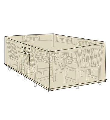 Our high-quality Large Deluxe Furniture Cover for Rectangle/Oval Dining Table and Chairs is made to stand up to sun, wind, rain and extreme temperatures. Two layers of tough polyester fabric protect against moisture – rain runs right off. Covered vents allow for air flow, helping to prevent mildew during storage. Sturdy handles make the cover easy to use, while elastic toggle ties keep it secure. A metal center support rod helps prevent water and debris from accumulating, reducing standing water for better protection. The attractive sand color looks great and resists fading. Cover fits most rectangle tables with 6 chairs. Cover life expectancy varies according to climate, weather exposure, care and usage. Imported.Please note: This cover fits rectangular and oval table sets; it is octagonal/oval in shape with angled end corners to eliminate excess material for a better fit. Dimensions listed are maximum length and width at longest and widest points on ends and sides.